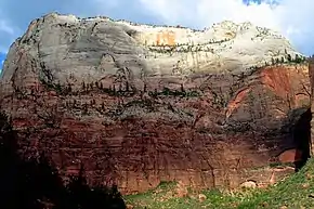 The Great White Throne[2] is a monolith, predominantly composed of white Navajo Sandstone in Zion National Park in Washington County in southwestern Utah, United States.[1] The north-west "main" face rises 2,350 feet (720 m) in 1,500 feet (460 m) from the floor of Zion Canyon near Angels Landing. It is often used as a symbol of Zion National Park. The Great White Throne can be seen from most locations along the scenic drive running through Zion Canyon.