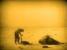After filming in San Francisco wrapped in late June, the production traveled to Death Valley. Most Hollywood films that required desert scenes settled for the local Oxnard dunes north of Los Angeles, but von Stroheim insisted on authenticity.[25] Death Valley had no roads, hotels, gas stations or running water and was occupied by tarantulas, scorpions and venomous snakes. The nearest populated area to the shoot was 100 miles (160 km) away and insurance coverage was denied.[44] Filming in Death Valley lasted for two months during midsummer, allowing actors Gowland and Hersholt time to grow the beards necessary for the sequence.[45] Some members of the production reported temperatures between 91 and 161 °F (33 and 72 °C), but the highest temperature officially recorded in Death Valley during the period was 123 °F (51 °C).[46] Of the 43 members of the cast and crew who worked on the Death Valley sequence, 14 became ill and were sent back to Los Angeles.[47]
