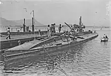 Construction was completed on 11 November 1911, limited trials were conducted at the port as the installation of the ship's equipment continued. The early trials were supervised by Lieutenant Commander Stefanos Paparrigopoulos and seven other Greek officers. Basic trials and equipment installation was completed on 11 January 1912, Delfin was then transported by barges to the Schneider trial station at St. Mandrier, near Toulon. Considerable time delays in carrying out sea trials and equipment checks led to the postponement of the commissioning until 9 August 1912. A few days later maximum depth trials were performed with the ship diving to 36 m (118 ft). During the course of August and September the ship's crew underwent intense training under the guidance of French officers specializing in submersibles. Most of the training dives took place on a French submarine rather than Delfin itself. As tensions between Greece and the Ottoman Empire escalated the decision was taken for Delfin to depart for Greece before her crew's training had been completed.[8][9] Delfin sailed for Greece on 29 September, the ship traveled on the surface and unescorted, arriving on Corfu on 4 October to repair damage to her left engine. She reached her destination the Port of Piraeus the following day, where she was welcomed by the commander of the British naval mission Rear Admiral Lionel Grant Tufnell, the Minister of Naval Affairs Nikolaos Stratos and the Finance Minister Alexandros Diomidis. The same day Greece declared war against the Ottomans, joining the rest of the Balkan League in the First Balkan War.[10][11] This unescorted, non-stop journey of 1,100 mi (1,800 km) 1,100 miles set a world record and confirmed the abilities of her crew, despite their limited training. However, it also meant that no reserve crew could be trained, limiting her battle effectiveness due to the crew's fatigue.[12] Moreover the Salamis Naval Base did not have the necessary technical facilities to service this new type of ship.[10] It possessed neither specialized workshops nor separate power generators and compressors to address the needs of the ships. [13] Delfin was the first submarine to enter the service of the Greek navy. [14] Nordenfelt I which had been ordered in 1884, had disappointed the Greek authorities during its trials in early 1886 and its purchase was subsequently cancelled. Its hull was abandoned in Piraeus.[15]