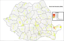 Among the towns and communes in Romania with the highest proportions of Greeks as of 2011 are Izvoarele (Greek: Ιζβοάρελε; 43.82%) and Sulina (Greek: Σουλινάς; 1.69%), both in Tulcea County.