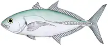 The species was first scientifically described by the French biologist Charles Frédéric Girard in 1858, who named the species Trachurus boops, placing the species in the horse mackerel genus based on the holotype taken off of San Diego, California.[3] With the instability of carangid taxonomy at the time, the species was reassigned to a number of genera, including Caranx, which created a taxonomic homonym with the Caranx boops described by Georges Cuvier in 1833. In 1868, British zoologist Albert Günther unaware of the prior naming independently renamed the species Caranx caballus based on specimens collected from Panama, one of which was designated to be the holotype.[4] The species was further renamed in 1870 by Franz Steindachner, who attempted to remove the Caranx boops homonym by simply renaming the species Caranx girardi. Later reviews of the Carangidae revealed this synonymy, and due to Gunther's' earlier naming, his species name was kept and attributed to him, while Cuvier's' Caranx boops was later moved to Selar boops.[5] The specific name caballus is Latin for 'horse', reflecting the common name of horse mackerel given to this and many similar species at the time.[6] William Smith-Vaniz has suggested the possibility C. caballus is conspecific with a very similar Atlantic species; Caranx crysos, but no studies into this relationship have been undertaken.[7] Its position in the genus Caranx has also been questioned recently by John Randall due to its unusual dentition. The common name 'green jack' is in reference to the species' common coloration, while 'horse jack' is derived from the Latin name. In Spanish-speaking nations, it is often known under broadly applied names including cocinero and caballa.[8]