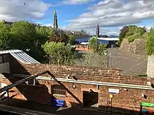 The West Burn flows down adjacent to Inverkip Road, and originally powered water mills downstream from the station site,[20] where a sugar refinery originated in 1826, and was expanded by John Walker and Co from 1848.[21][22] The river was culverted under the G&SWR railway and Inverkip Street, then taken above the West Station platforms and railway line in an open metal trough forming an aqueduct leading to a reservoir or mill pond just to the north of the station.[8]