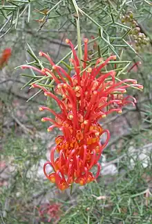 Grevillea treueriana, also known as Mount Finke grevillea or scarlet grevillea,[2] is a species of flowering plant in the family Proteaceae and is endemic to Mount Finke in South Australia. It is a shrub with pinnatisect leaves with 3 to 7 lobes, the end lobes linear and sharply pointed, and bright scarlet flowers on one side of the floral rachis.