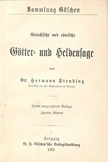 Griechische und römische Götter- und Heldensage (English: Greek and Roman mythology) is a book written by Hermann Steuding (1850-1917), which was published 1897 in Leipzig by G.J. Göschen. This book is a second edition of the original work "Griechische und römische Mythologie" published in 1892. The book offers an overview of the origins of Greek and Roman mythology. Since its publication, it has been reworked and translated multiple times and is his most famous publication. His work was well received, and has been described as valuable by proficient scholars.[1][2][3][4][5]