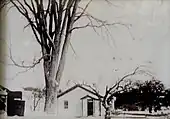 Griffins Mills Presbyterian Church in 1908 with horse stalls and schoolhouse in back