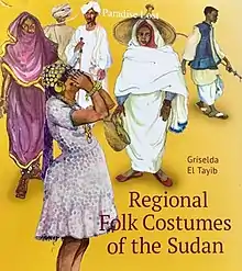 Published in 2017, El Tayib's illustrated book Regional Folk Costumes of the Sudan[4] is based on her sociocultural and anthropological research and presents her descriptions and paintings of selected Sudanese folk costumes. The scope of this book is limited to specific parts of the country, where the author could undertake field visits, using questionnaires and informal interviews during her research in the 1970s. As the lifestyles of Sudanese in different urban and rural areas vary considerably between traditional and modern forms, the book presents both local and traditional forms of dress as well as contemporary clothes and fashion in urban societies. This applies especially to the final chapter, written in 2016, that describes changes in Sudanese dress since her earlier research. Among other reasons, El Tayib attributed the modern changes in dress and related personal tastes to international influences by television, Arab fashion magazines and the dress codes adopted by the international Sudanese diaspora.[14]