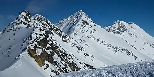 Grizzly Mountain is a 2,754-metre (9,035-foot) mountain summit located in Glacier National Park, in the Hermit Range of the Selkirk Mountains in British Columbia, Canada. Grizzly Mountain is situated 57 km (35 mi) northeast of Revelstoke, and 42 km (26 mi) west of Golden. It is also set 4 km (2.5 mi) north of Cheops Mountain, and 3 km (1.9 mi) west of Rogers Pass from which it can be seen from the Trans-Canada Highway. The closest peak to Grizzly is Ursus Minor Mountain, 1.27 km (0.79 mi) to the west-southwest, and its nearest higher peak is Mount Sifton, 2.35 km (1.46 mi) to the north.[3] The first ascent of the mountain was made August 31, 1901, by John E. Bushnell, August S. Eggers, Karl Schuluneggar, and Friedrich Michel via the southeast couloir.[1] The first ascent of the north ridge was made in 1921 by Neal Carter, Tom Fyles, and Don Munday. The class 5.2 west ridge was first climbed by Georgia Engelhard and Ernest Feuz in 1933. The mountain's name was adopted in 1906, then re-approved September 8, 1932, by the Geographical Names Board of Canada.[2] It was so-named because of its proximity above Bear Creek (since renamed Connaught Creek), and in keeping with the bear theme of other nearby features such as Ursus Major Mountain, Ursus Minor Mountain, Bruins Pass, and Balu Pass.[4]