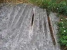 A stone with grooves that has been put in the border of a prehistoric grave. The grooves are on the side of the stone. Gotland