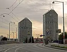 The Grunwald Square was originally built in the late 20th century as a major southwest-northeast thoroughfare named Kaiserstraße (Imperial Street), which was designed to connect two newly constructed bridges, Grunwald Bridge and Szczytniki Bridge. During the Siege of Breslau in 1945, in the final months of World War II, the entire residential district along the Kaiserstraße was razed by order of the German Gauleiter Karl Hanke to construct a military airfield intended for use in resupplying the fortress city ("Festung Breslau"). The area remained undeveloped for a long time after World War II, and the huge empty space came to resemble a square rather than a street, influencing the post-war name change into Plac Grunwaldzki (Grunwald Square). Post-war development started in the 1950s with construction of new buildings for the Wrocław University of Science and Technology, which was followed by new projects for two other nearby universities, Wrocław University of Environmental and Life Sciences (then known as Agricultural Academy in Wrocław) and the University of Wrocław. A major communist-era landmark, a complex of apartment buildings (pl:Zespół mieszkalno-usługowy przy pl. Grunwaldzkim we Wrocławiu) known colloquially as "Sedesowce" (lit. toilet seats) or "Manhattan",[1] was built in 1967-1975 at the western end of the square, while another landmark, "Kredka" and "Ołówek" student houses, were constructed in 1975-1982 at the eastern end. The central part of the square remained undeveloped until a redevelopment in 2006, and housed an improvised, open air market.
