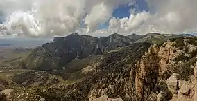 The Guadalupe Mountains reach their highest point at Guadalupe Peak, the highest point in Texas,[11] with an elevation of 8,751 feet (2,667 m).[12] The range lies southeast of the Sacramento Mountains and east of the Brokeoff Mountains. The mountain range extends north-northwest and northeast from Guadalupe Peak in Texas into New Mexico.[13] The northeastern extension ends about 10 miles (16 km) southwest of Carlsbad, near Carlsbad Caverns National Park; the southwest tip ends with El Capitan about 90 miles (140 km) east of El Paso. The mountains rise more than 3,000 feet (910 m) above the arid floor of the Chihuahuan Desert.[11] The Guadalupe Mountains are surrounded by the South Plains to the east and north, Delaware Mountains to the south, and Sacramento Mountains to the west.