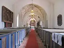 The main altarpiece of the church is from 1704, but the church also contains an altarpiece from the 1510s, displayed on one of the nave walls. It was most likely made in norther Germany. The baptismal font and the pulpit both date from the 17th century.[1]
