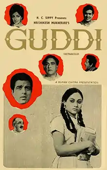 Guddi is a 1971 Indian Hindi drama film directed by Hrishikesh Mukherjee and written by Gulzar. It starred Dharmendra, Jaya Bachchan and Utpal Dutt. It is Jaya Bachchan (née Bhaduri)'s career-making film in which she plays a schoolgirl who has a crush on and is obsessed with the actor Dharmendra, who plays himself. She earned a Filmfare nomination as Best Actress, the only nomination for the film. Utpal Dutt also has a starring role. Many Bollywood actors like Rajesh Khanna, Naveen Nischol, Asrani, Amitabh Bachchan, Vinod Khanna, Om Prakash and Pran gave guest appearances as themselves.[1][2] According to Boxofficeindia.com, the film became a "big city hit" and did "above average" business everywhere else.[3] It was later remade in Tamil as Cinema Paithiyam (1975) starring Jayachitra and .Jayasankar[4]