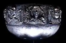 The Gundestrup cauldron is a richly decorated silver vessel, thought to date from between 200 BC and 300 AD,[1][2] or more narrowly between 150 BC and 1 BC.[3] This places it within the late La Tène period or early Roman Iron Age. The cauldron is the largest known example of European Iron Age silver work (diameter: 69 cm (27 in); height: 42 cm (17 in)). It was found dismantled, with the other pieces stacked inside the base, in 1891, in a peat bog near the hamlet of Gundestrup in the Aars parish of Himmerland, Denmark (56°49′N 9°33′E / 56.817°N 9.550°E).[4][5] It is now usually on display in the National Museum of Denmark in Copenhagen, with replicas at other museums; during 2015–16, it was in the UK on a travelling exhibition called The Celts.[6]