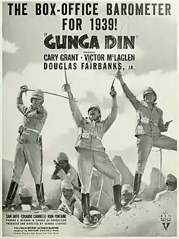 Gunga Din is a 1939 American adventure film from RKO Radio Pictures directed by George Stevens and starring Cary Grant, Victor McLaglen, and Douglas Fairbanks Jr., loosely based on the 1890 poem of the same name by Rudyard Kipling combined with elements of his 1888 short story collection Soldiers Three. The film is about three British sergeants and Gunga Din, their native bhisti (water bearer), who fight the Thuggee, an Indian murder cult, in colonial British India.