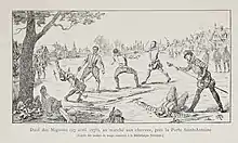 The situation became too much for Alençon, and he fled court in February. Shortly after his departure, the favourites of Henri began quarrelling with those of the duke of Guise. At 5am on 27 April, members of the two groups of favourites met for a duel. On one side was Caylus, with Maugiron and Livarot as his seconds. On the other side was Entraguet, with Ribérac and Schomberg as his seconds. The two sides met at the horse market near porte Saint-Antoine, in the hopes of settling a dispute that had nominally arisen over a woman, according to Brantôme.[8] The king's favourites had been angling to strip Guise of his office of grand maître so that it might be given to Caylus, and it is possible this was also a factor in the duel.[9] The duel was kept a secret from the court, as the king had intervened to stop a previous duel that had been arranged between the favourites on 2 April.[10]