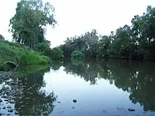 Over its entire distance, the Gwydir River falls around 616 metres (2,021 ft) in elevation from its headwaters, at an elevation of 760 metres (2,490 ft) above sea level to when it joins the Barwon River at an elevation of 144 metres (472 ft) above sea level. The Gwydir River's total length is 488 kilometres (303 mi), in which space and thirty-four tributaries feed into it over its entire length; including the Horton River, Warialda Creek, Laura Creek and Moredun Creek.[2][3][4][5]