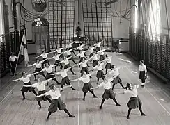 The Federation of International Gymnastics (FIG) was founded in Liege in 1881.[12] By the end of the nineteenth century, men's gymnastics competition was popular enough to be included in the first modern Olympic Games in 1896. From then on until the early 1950s, both national and international competitions involved a changing variety of exercises gathered under the rubric, gymnastics, that included, for example, synchronized team floor calisthenics, rope climbing, high jumping, running, and horizontal ladder. During the 1920s, women organized and participated in gymnastics events. The first women's Olympic competition was limited, only involving synchronized calisthenics and track and field. These games were held in 1928 in Amsterdam. By 1954, Olympic Games apparatus and events for both men and women had been standardized in modern format, and uniform grading structures (including a point system from 1 to 15) had been agreed upon. In 1930, the first UK mass movement organisation of women in gymnastics, the Women's League of Health and Beauty, was founded by Mary Bagot Stack in London.[13] At this time, Soviet gymnasts astounded the world with highly disciplined and difficult performances, setting a precedent that continues. Television has helped publicize and initiate a modern age of gymnastics. Both men's and women's gymnastics now attract considerable international interest, and excellent gymnasts can be found on every continent.