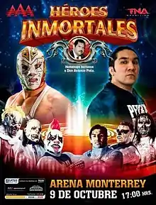 Héroes Inmortales (2011) (Spanish for "Immortal Heroes") was a professional wrestling pay-per-view (PPV) event produced by the AAA promotion, which took place on October 9, 2011, at Arena Monterrey in Monterrey, Nuevo León, Mexico, commemorating the fifth anniversary of the death of AAA founder Antonio Peña. While the two previous Peña memorial shows were labeled with the Roman numerals III and IV, the 2011 event was simply known as Héroes Inmortales.[3] The main attraction of the event was the Mexican debut of Sting, who took part in the ongoing storyline invasion of wrestlers from American promotion Total Nonstop Action Wrestling (TNA).[4][5][6][7] TNA performers Abyss, Jeff Jarrett, Magnus and Velvet Sky also took part in the event.[8] Other matches taking place at the event included the fifth annual Copa Antonio Peña, Dr. Wagner Jr. defending the AAA Latin American Championship against El Hijo del Perro Aguayo and the culmination of the yearlong rivalry between Los Perros del Mal and Los Psycho Circus in a Lucha de Apuestas Masks vs. Hairs match, at the end of which one team would be either forced to unmask or have their heads shaved.[9]