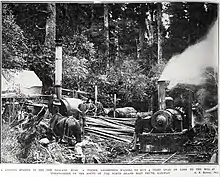 There were at least three tramway networks in the area, which took timber to sawmills and the railway. Gibbs & Trevor had a tramway running west from the station and George Gardner had tramways to the north west.[6] They had a 1927 Type Cb 0-4-4-0 built by A & G Price.[16] In 1906 a tramway ran to the PWD siding and next year, W G Irvine applied to run one beside the railway. Quin Bros siding was noted in 1909[10] and, in 1910, owners of the Hawera Sash & Door Co Ltd,[17] had a 4 mi (6.4 km) tramway linking their logging area to their mill and the railway.[18] They used a 1909 Type A 0-4-0 T built by J. Johnston's Vulcan Foundry at Invercargill and a 1914 0-4-4-0 by G & D Davidson Ltd. of Hokitika. The tramways were dismantled about 1934, when the bush had been cleared.[16][19]
