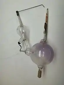 X-rays are generated when high energy electrons are stopped by a hard target. In the earliest tubes, the electrons were generated by the collision of positive ions with the cathode. To produce the ions, a low pressure gas had to be maintained inside the tube. Unfortunately, as this type of tube is used, the low pressure gas is gradually depleted causing the tube current and therefore the x-ray output to fall. The operator could compensate for this by increasing the voltage on the tube, but this would produce "harder" or more penetrating x-rays. In many cases this degraded the image quality. One early solution was to introduce a small amount of gas back into the tube. Unfortunately this procedure was difficult to control and it only provided a temporary solution. Saÿen's design solved this problem by a clever strategy that ensured a constant gas pressure in the tube. As the gas in the main part of the Saÿen tube (see photo) is depleted, the electrical resistance in the tube would increase causing the current to take a lower resistance path: a spark through the air gap to the wire leading to the smaller bulb. That current would heat the material in the small bulb and cause it to release gas back into the main tube. Once the gas pressure rose in the main tube, its electrical resistance would drop back into normal operating range. The gas pressure in the tube could be adjusted by controlling the size of the air gap: a larger gap meant that the tube would operate at a higher voltage with harder (higher energy, more penetrating) x-rays. Saÿen used potash (potassium hydroxide, KOH) in the side bulb but other chemicals that would outgas when heated were also used.[5] James W. Queen & Company manufactured and sold the "Queen Self Regulating X-Ray Tube" for several years.