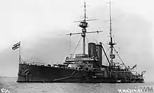 HMS Africa was laid down at Chatham Dockyard on 27 January 1904, launched on 20 May 1905, the ship was supposed to be christened by the Marchioness of Salisbury, however, due to unforeseen illness, Lady Londonderry took her place.[7] The construction of the ship was completed in November 1906. Named for the British Empire's colonies in Africa, she was the last battleship constructed at Chatham, later classes of battleships being too large for the yard. Africa commissioned on 6 November 1906 at Chatham Dockyard for service in the Atlantic Fleet. She transferred to the Channel Fleet on 4 March 1907 and collided with the merchant steamer SS Ormuz off Portland on 23 March 1907, suffering only slight damage. Africa transferred to the Nore Division, Home Fleet, in June 1908, and in April 1909 joined the Second Division, Home Fleet. During this service she commissioned at Chatham as flagship of Vice Admiral Sir William Henry May, commander of the Third and Fourth Divisions, Home Fleet, on 25 April 1911; the battleship King Edward VII relieved her of this duty on 24 July 1911. In November 1911, she was placed in reserve at the Nore.[8][9][10]