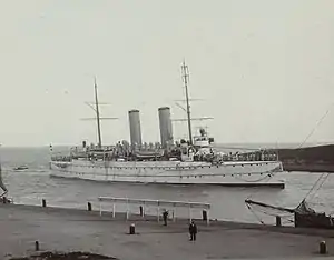 The ship was 93.3 metres (306 ft 1 in)[1] long, had a beam of 14.8 metres (48 ft 7 in), a draught of 5.41 metres (17 ft 9 in), and had a displacement of 3,900 ton.[1] The ship was equipped with 2 shaft reciprocating engines, which were rated at 10,000 ihp (7,500 kW) and produced a top speed of 20 knots (37 km/h). The ship had a deck armour of 2 in (5.1 cm). Two 5.9 in (15 cm) single turret guns provided the ship's main armament, and these were augmented by six single 4.7 in (12 cm) guns and four 3 in (7.6 cm) single guns. The ship had a complement of 324 men.[2]