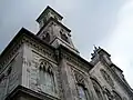 The property where the Church stands used to be the site of a Greek Orthodox cemetery and hospital.[6] This was demolished in order to build the Church. Its construction, based on the designs of the Ottoman Greek architect P. Kampanaki, began on 13 August 1876 and was completed on 14 September 1880.[2][7][8] The Church is built in neo-baroque style with elements of a basilica,[9] and with the unusual features of twin bell towers, a large dome and a neo-gothic facade.[2] The Hagia Triada was the first domed Christian church that was allowed to be built in Istanbul after the Fall of Constantinople in 1453.[9]