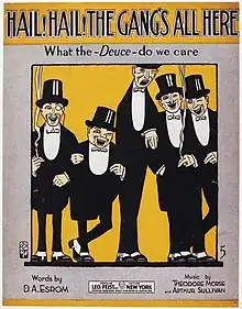 Hail, Hail, the Gang's All Here is an American popular song first published in 1917. The lyrics, written by D. A. Esrom (pseudonym of Theodora Morse) to a tune composed by Arthur Sullivan for the 1879 comic opera The Pirates of Penzance,[1] are: