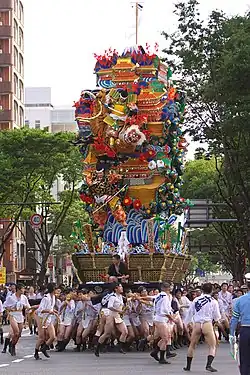 Hakata Gion Yamakasa (博多祇園山笠) is a Japanese festival celebrated from the 1st until the 15th of July in Hakata, Fukuoka. The festivities are centered on the Kushida Jinja. The festival is famous for the Kakiyama, that weigh around one ton and are carried around the city as an act of float-racing. The festival is believed to be over 770 years old and attracts up to a million spectators each year. It was designated an Important Intangible Folk Cultural Property of Japan in 1979.[1][2][3] The sound of the Yamakasa has also been selected by the Ministry of the Environment as one of the 100 Soundscapes of Japan.[4][5]