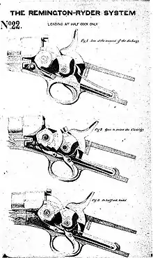 Likewise, some early types of repeating lever action cartridge rifles—such as the Winchester Model 94 rifle—had a half-cock position that was intended to serve as a safety mechanism, to keep the hammer away from the firing pin while holding the rifle when a round was chambered, such as when in a blind awaiting game to appear.[6] Although the practice is less common today, the half-cock notch position on such rifles was formerly used by many hunters as a safety when carrying the loaded rifle with a round chambered while hunting.[7] The half-cock position of the hammer did not serve a purpose while loading such firearms.[8]