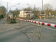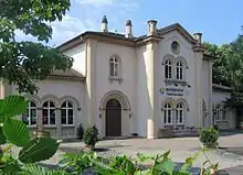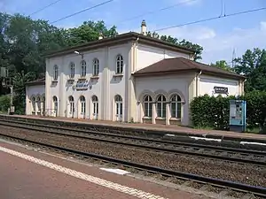 The entrance building is one of the oldest surviving in Hesse. It was put into operation on 10 September 1848. It was designed by Julius Eugen Ruhl.[5] He placed it directly at the intersection of Hochstädter Landstraße with the Burgallee, the connection between the Park Wilhelmsbad and the Baroque palace of Schloss Philippsruhe, which was the residence of the Count of Hanau when the station was established. The station building was therefore equipped with a Fürstenzimmer (prince's room), which occupied the central part on the ground floor of the entrance building, as a waiting area for the "highest and most supreme rulers".[6] In the 1990s, the building was privatised and has since been used for a restaurant. The entrance building is listed as a cultural monument under the Hessian monument protection law. Today it is included with the architectural ensemble of the park of Wilhelmsbad.[7]