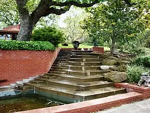 The house is one-story high with a central clerestory[9] (an outside wall of a room or building that rises above an adjoining roof and contains windows) and is constructed of native redwood board[7] and batten, common wire-cut San Jose brick,[5] concrete and plate glass. The house clings to, and completes the hillside on which it was built as the floor and courtyard levels conform to the slope of this one and one-half acre site. The entire site includes the main house, a guesthouse, hobby shop, storage building, double carport, breezeway, and garden house with pools and water cascade.
