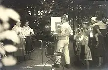 The family moved back to Germany in the 1890s, to Weimar, where Diehl finished his secondary school education and entered the renowned Weimar Akademie für bildende Künste—the Academy of Fine Arts. He received his diploma from the Akademie in 1896, having studied under the Norwegian genre painter Carl Frithjof Smith (1859–1917) and Max Thedy (1858–1924), then as a master’s student with Professor Theodor Hagen, considered one of the founders of German Impressionism. In 1898, he went to study drawing at the Städelsches Kunstinstitut in Frankfurt with Bernhard Mannfeld (1848–1925), who remained a lifelong friend and confidant. During these years of study, he traveled to Paris, Switzerland, the Baltic coast, and Hungary. During his years in Frankfurt, he established a lifelong friendship with the German naturalist painter Wilhelm Trübner; the older artist helped Diehl to establish himself as an academic painter. Through Trübner, he gained access to the Kunstsalon Bangel, where he participated in his first group exhibition in 1900. Of his works in this show, one critic praised his "quiet landscapes" as imparting a sense of rumination on life and stillness.[2] [lower-alpha 2] At this time he began referring to himself as Hanns Diehl-Wallendorf, apparently as a way to distinguish himself from another artist named Hans Diehl.