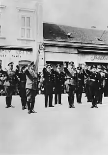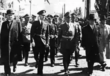 At the beginning of September 1941, Globke accompanied Interior Minister Frick and State Secretary Stuckart on an official visit to Slovakia, which at that time was a client state of the German Reich. Immediately following this visit, the government of Slovakia announced the introduction of the so-called Jewish Code, which provided the legal basis for the later expropriations and deportations of Slovak Jews. In 1961, Globke denied there was any connection between the two events and the allegation that he had participated in the creation of the Code. Clear evidence for it was never verified.[28] According to CIA documents, Globke was possibly also responsible for the deportation of 20,000 Jews from Northern Greece to Nazi extermination camps in Poland.[29][30]