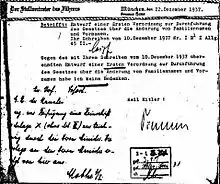 This ordinance tied in with the restrictive principles for the treatment of Jewish name changes formulated in the Prussian Ministry of the Interior in 1909 and 1921, but now placed these changes openly in the context of an anti-Jewish attitude.[11] In the circular issued by Globke on naming rights, it was said that every name change impairs "the recognisability of origin from a family", facilitates "the obscuration of marital status" and conceals "the blood descent".[12]