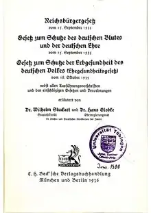 Globke was responsible for preparing legal commentaries and explanations for his areas of responsibility. In 1936, together with his superior, State Secretary Wilhelm Stuckart, he published the first commentary on the Nuremberg Laws and their implementing regulations. This proved to be particularly influential for the interpretation of the Nuremberg Laws because it was given an official character. Originally, Globke was only supposed to comment on matrimonial issues as Stuckart wanted to do the rest of the work himself, but Stuckart became ill for a long time, so Globke wrote the commentary on his own. Stuckart ended up only writing the extensive introduction.[20] In this context, Globke's later defense lawyers pointed out that he was not to be held responsible for Stuckart's racist choice of words and that his commentary on the law interpreted the Nuremberg Laws narrowly in comparison to later comments. In individual cases, especially in the case of so-called mixed marriages, this has proven to be beneficial for those affected.[21]