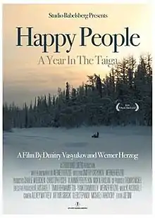 Happy People: A Year in the Taiga is a 2010 documentary film directed by Dmitry Vasyukov, with English narration written and voiced by Werner Herzog.[2] The film depicts the life of the people in the isolated village of Bakhta (62°27′52″N 89°00′08″E / 62.464463°N 89.002168°E) at the confluence of the Yenisei and the Bakhta River, in the eastern Siberian taiga. In particular, it focuses on the Russian trappers who hunt for fur animals, such as sable, and fish, depicting their cyclical, self-reliant life dealing with the subarctic climate and geographic isolation. It also briefly looks at the life of native Ket people in the village, and some notable people including an honored WWII veteran. The footage in the documentary was edited from a 2007 4-part television mini-series by Vasyukov.[3]