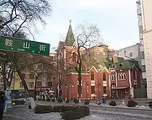 Harbin Nangang Christian Church (simplified Chinese: 哈尔滨南岗基督教会; traditional Chinese: 哈爾濱南崗基督教會) is a Protestant (formerly Lutheran) church in Harbin, Heilongjiang Province, China. The current building was built in 1916 and is located in Church Street, along East Dazhi Avenue, northeast of Hongbo Square. Its address is: No. 252, East Dazhi Avenue, Nangang District, Harbin. The church is next to the Eastern Orthodox Church of the Intercession and is almost identical in color to the Orthodox church beside it, with the same red walls and green roofs.
