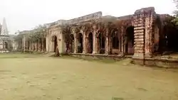 Haripur Barabari is a multi domed three stored building. Area and stylish architecture implies the historical craft, architecture and structural perfection. This palace boundary acquires nearly 5 acres of high land with 60 chambers including Theater, Darbar Hall, Store house, Cowsheds, Kitchen, Casino, Play ground, Pagoda, Temple, small pond etc. Six stare cases are at six side of the palace for first floor and two stare cases for second floor. Six bedrooms at the north-west, four at the east and four at the west side of the pond. There is a big brick build wharf(Bengali: সান বাঁধানো ঘাট) at the west of the palace that falls on the river and both sides decorated by pagodas of Krishna Prasad Roy Choudhury at the north and Gouri Prasad Roy at the south.[1][3][4] People of this area used river route for communication and comfortable journey and most probably wharf kept as the main gate for the same purpose.