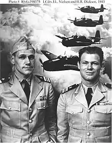 ![]() Lieutenant Commander Harlan R. Dickson (right) with Lieutenant Commander John L. Nielsen, both members of U.S. Navy dive bomber Squadron 5 in the early months of World War II, at the Department of the Navy in Washington, D.C., c. July 1943. | |