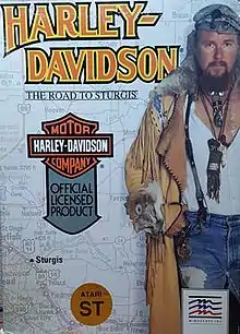 Harley Davidson:The Road to Sturgis, is a video game produced by Mindscape, Inc.[1] in 1989. The game received mixed reviews after its release, some gamers citing the graphics as better than average, and others disappointed in how quickly the game became "tedious" and "repetitive" and could be beaten. The point of the game is to get to the annual motorcycle rally in Sturgis in 10 days. To get there you must ride on the highway, avoiding obstacles and stopping at pit stops.[2]