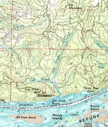 1981 USGS topo map showing Harlows Creek as Jim Crow Creek. Also shows Jim Crow Hill, Jim Crow Point, and Jim Crow Sands.