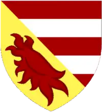 Per bend barry of six Gules and Argent and Or in base a Lion's Gamb erased of the first