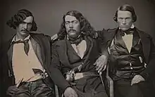 Harry Love - in the middle - with William Henderson -- to his left - and an unidentified California Ranger - thought to be William "Bill" Byrnes - to his right -.