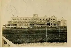 From 1886 to at least 1907, William Thompson managed the hotel, including a massive expansion of the building. The hotel was raised off the ground, creating a crawl space, and had the third floor, gambrel roof, dormers, central tower, large porches, water tower (now public bathrooms and an office), and additional rooms added to the bay side. In addition, cedar shingles replaced the white siding. Gas lamps lit the various types of rooms. As a fire precaution, Thompson covered the walls and ceilings of the main dining room (now the lobby and bookstore) with decorative tin, most of which remains today. The hotel went out of business around 1910, and Harvey Cedars Beach Company sold it by 1912. It suffered a succession of owners until sold to the YWCA of Philadelphia, which turned the property into a Christian summer camp for young women named Camp Whelen from 1923 to 1935.