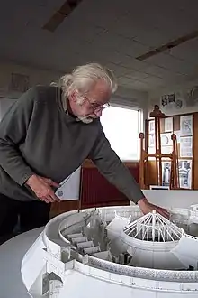 Haukur Halldórsson adjusting a model of a Viking village (2002)