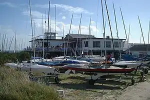 The "old" club house was built in 1936 when the club moved to its present site, a unique position on the southern shores of Chichester Harbour, on the bulbous tip of a narrow peninsula, known as Sandy Point. Here it dominates the harbour entrance and provides immediate access either to the open sea or to the expansive, land-locked waters of the harbour. Sailing is possible at all stages of the tide and times of year.