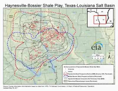 The Haynesville Shale is an informal, popular name for a Jurassic Period rock formation that underlies large parts of southwestern Arkansas, northwest Louisiana, and East Texas. It lies at depths of 10,500 to 13,000 feet below the land’s surface.[1][2] It is part of a large rock formation which is known by geologists as the Haynesville Formation. The Haynesville Shale underlies an area of about 9,000 square miles and averages about 200 to 300 feet thick. The Haynesville Shale is overlain by sandstone of the Cotton Valley Group and underlain by limestone of the Smackover Formation.[3][4]