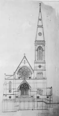 In the Victorian era, Headingley, being at that point a village separate to the busy town of Leeds, became a popular residential area, and therefore by the 1860s had many large stone villas, such as Ashwood Villas close by the church. New amenities were required for the expanding population.[1] The Headingley Hill Church Building Committee was set up on 22 January 1864, with the objective of constructing "an elegant structure" with the capacity for six hundred people.[2] The choice of architect was considered at a meeting one month later; from a list of eight, four were selected – Joseph James of London, J P Pritchett of Darlington, and William Hill and Cuthbert Brodrick of Leeds.[3][note 1] An architectural competition was initiated, being a popular method of getting the best design from a surplus of architects, with each of the four invited to submit.[4]