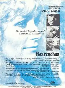 Heartaches is a 1981 Canadian comedy film written by Terence Heffernan and directed by Donald Shebib. It stars Margot Kidder, Annie Potts, Winston Rekert and Robert Carradine. The movie is about two young women who form an unlikely friendship on a bus ride to Toronto.